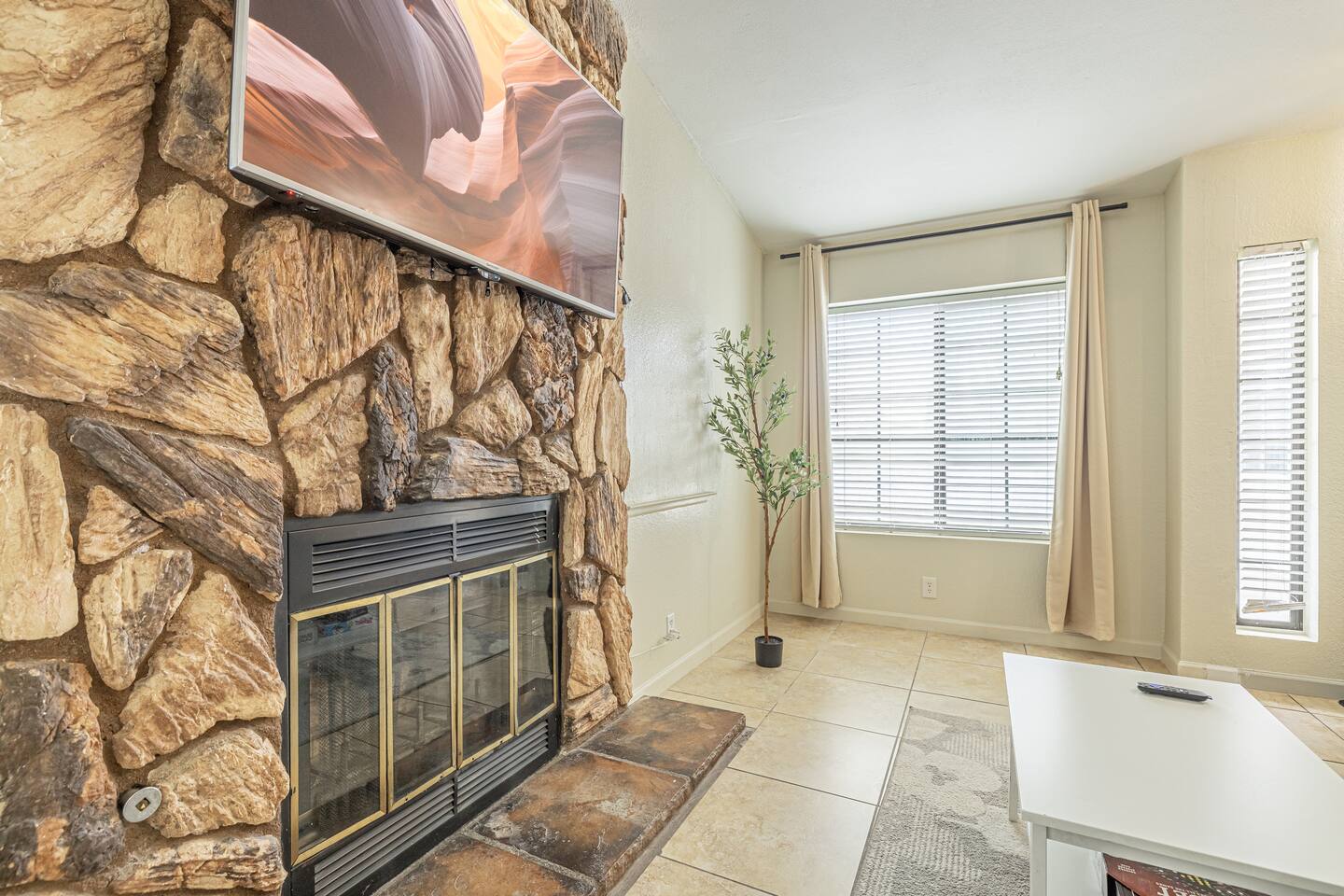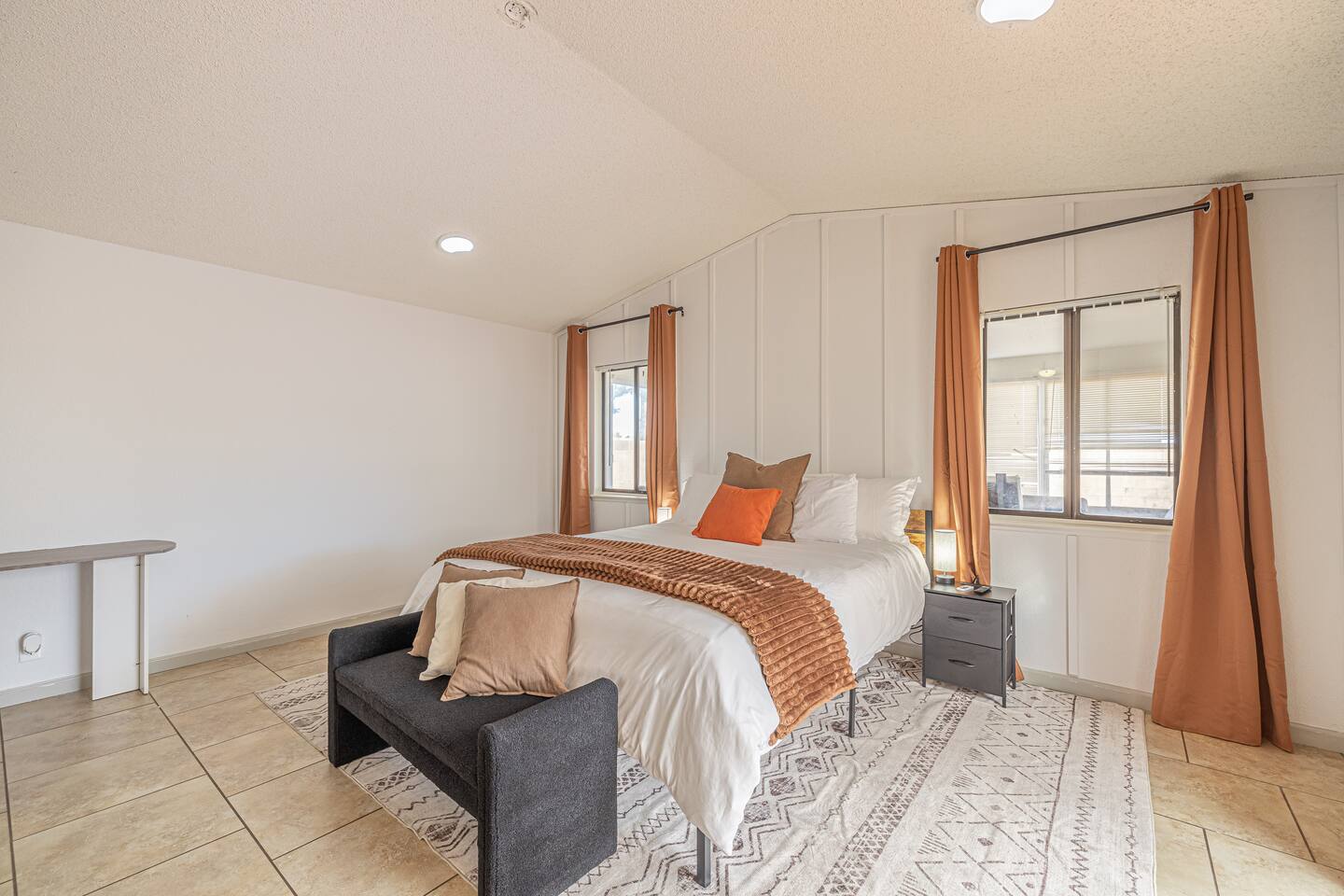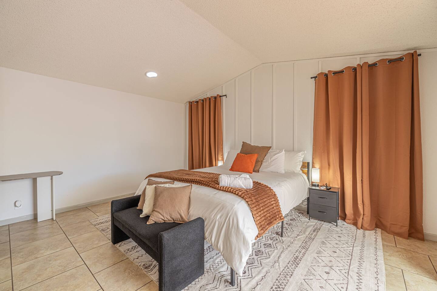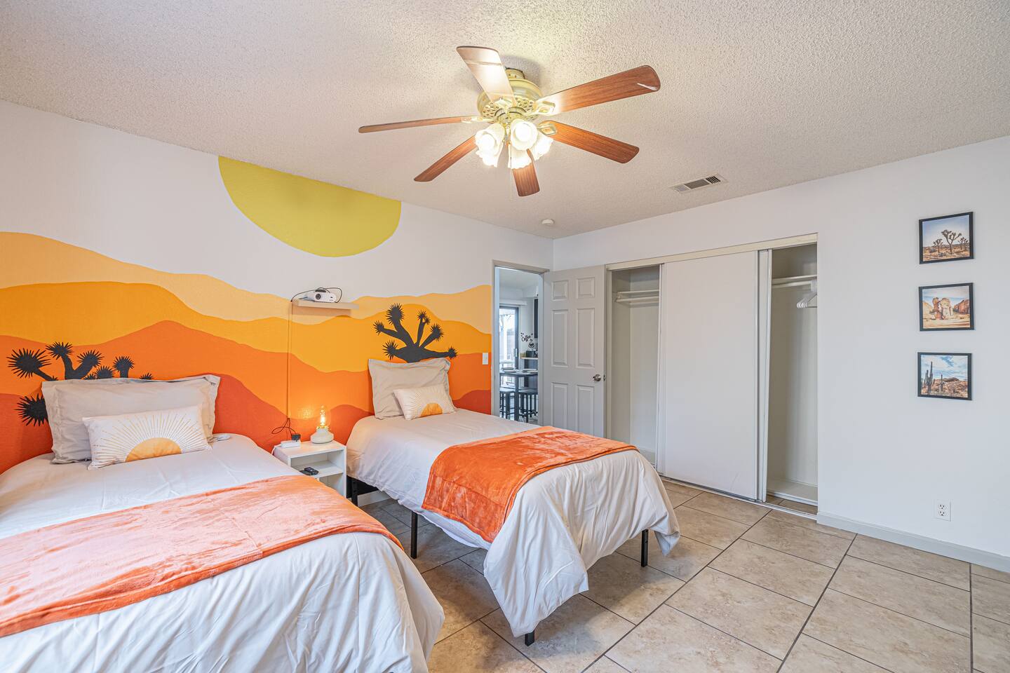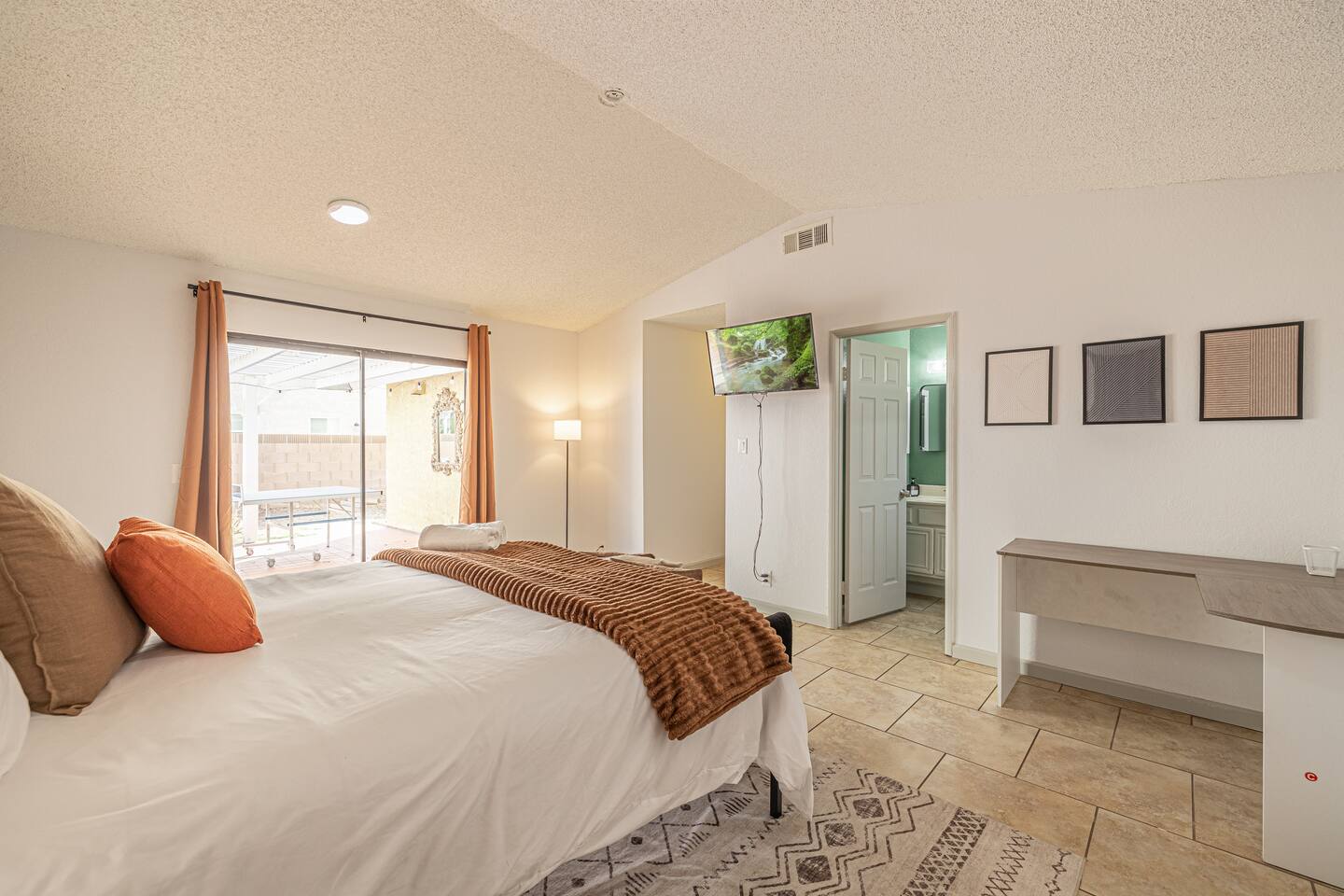 We take great pleasure in welcoming you to our Desert Oasis. This Desert Oasis themed home offers everything you would ever need for a perfect care-free retreat in a spacious area, with a theme that compliments the natural light, desert, and warm delight decor. This home is the main house to a duplex home. You have access to the entire home, there is only one shared space which is the driveway. The Desert Oasis conveniently combines the living room, Dining room, kitchen, Huge backyard, 2 bathrooms, & 2 bedrooms. Large windows allow for plenty of natural light to illuminate the space, and along with beautiful tile floors, tasteful finishes, and leafy plants, to create a pleasantly warm ambiance. ★ BEDROOM 1 ★ ✔ CAL-KING-Size Bed Hybrid Mattress with Pillows, Linens, and Sheets ✔ 40in Smart TV ✔ Two Night Stands with Built in Outlets & Reading Lamps ✔ Private Full Bathroom ✔ Dedicated Desk with chair ✔ Private Access Door to Backyard ✔100% BlackOut Curtains ✔ Bed Bench ✔ Closet With Hangers ★ BEDROOM 2 ★ ✔ Two Twin Beds Memory Foam with Pillows, Linens, and Sheets ✔ Movie Projector TV ✔ Nightstand with Reading Lamp ✔ Closet With Hangers ★ LIVING AREA ★ ✔ 50 In Smart TV ✔ Comfy Couch seats 5 ✔ Coffee Table ✔ Lamp for added lightning ✔ Welcome Desk ✔ Board Games ★ KITCHEN ★ ✔ Microwave ✔ Toaster ✔ Oven & Stove ✔ Blender ✔ Baking sheets ✔ Refrigerator/Freezer ✔ Spice Rack ✔ Keurig Coffee Maker (Complimentary Pods) ✔ Sink - Cold Water and Hot water ✔ Trays ✔ Glasses ✔ Silverware ✔ Children's dinnerware ✔ Pots & Pans ✔ Hot Plate ✔ dining table set for 6 ★ BATHROOM 1 ★ ✔ Bathtub ✔ Vanity ✔ Mirror ✔Hair dryer ✔ Toilet ✔ Towels ✔Shampoo, Conditioner, Body Wash ✔ Essential Toiletries ★ BATHROOM 2 ★ ✔ Bathtub ✔ Vanity ✔ Mirror ✔Hair dryer ✔ Toilet ✔ Towels ✔Shampoo, Conditioner, Body Wash ✔ Essential Toiletries ★ Laundry Located on Side of Home Outside★ ✔ Free Washer And Dryer (included in stay) ★ Closet ★ ✔ Hangers ✔ Mop , Broom and Vacuum ✔ Ironing Board ★ Backyard ★ ✔ PingPong Table ✔ String Lights ✔ free washer and dryer included in stay Located on The Side of the Home ✔ Covered Patio and Big Spacious Outside Area We look forward to hosting you. Let us know if you have any questions; we're locals; we have the answers. Happy Travels!