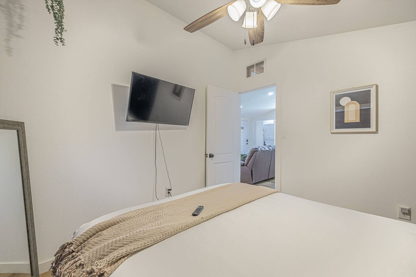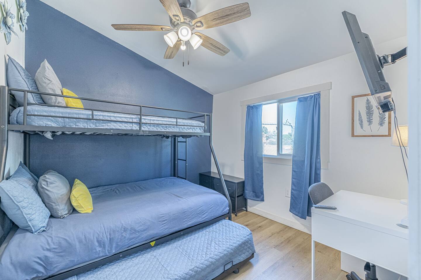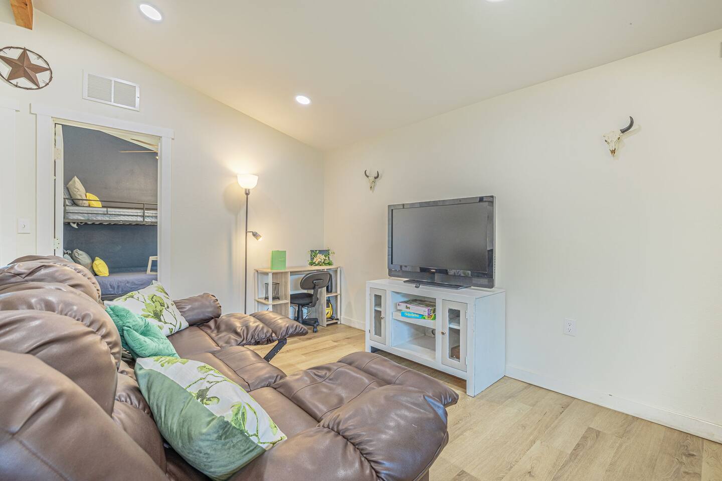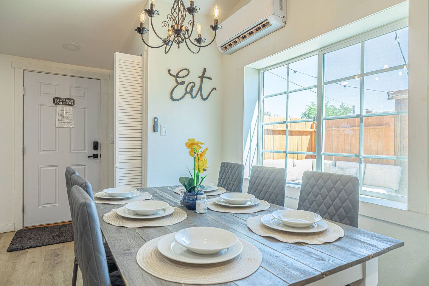 We take great pleasure in welcoming you to our Modern Ranch. This Farmhouse themed home offers everything you would ever need for a perfect care-free retreat in a spacious area, with a theme that compliments the natural light, western, and ranch delight decor. This home is a guest house. You have access to the entire home but to enter you will be passing through a driveway and a small dirt road. The Modern Ranch conveniently combines the living room, kitchen, and dining area with 2 bedrooms and smart tv's in each room to accommodate a joyful stay. Large windows allow for plenty of natural light to illuminate the space, and along with beautiful wooden floors, tasteful finishes, and leafy plants, to create a pleasantly warm ambiance. ★ BEDROOM 1 ★ ✔ Queen-Size Bed with Pillows, Linens, and Sheets ✔ 32in Smart TV ✔ Night Stand with Reading Lamp ★ BEDROOM 2 ★ ✔ Trundle Bunk Bed (2 Twin Size & 1 Full Size) with Pillows, Linens, and Sheets ✔ 32in Smart TV ✔ Stationary Desk for a dedicated workspace ✔ Dresser to place clothing ★ LIVING AREA ★ ✔ Smart TV ✔ Comfy Couch ✔ Stationary Desk for a dedicated workspace ✔ Side Coffee Table ✔ Lamp for added lightning ✔ Dimmable light switch for eye's convenience ✔ Board Games ★ KITCHEN ★ ✔ Microwave ✔ Toaster ✔ Blender ✔ Baking sheets ✔ Refrigerator/Freezer ✔ Keurig Coffee Maker (Complimentary Pods) ✔ Sink - Hot & Cold Water ✔ Trays ✔ Glasses ✔ Silverware ✔ Children's dinnerware ✔ Pots & Pans ✔ Hot Plate ✔ dining table set for 6 ★ BATHROOM ★ ✔ Rainfall Shower Head ✔ Bathtub ✔ Vanity ✔ Mirror ✔Hair dryer ✔ Toilet ✔ Towels ✔ Essential Toiletries ★ Laundry Closet ★ ✔ free washer and dryer included in stay ✔ clothing rack ✔ Ironing Board We look forward to hosting you. Let us know if you have any questions; we're locals; we have the answers. Happy Travels!