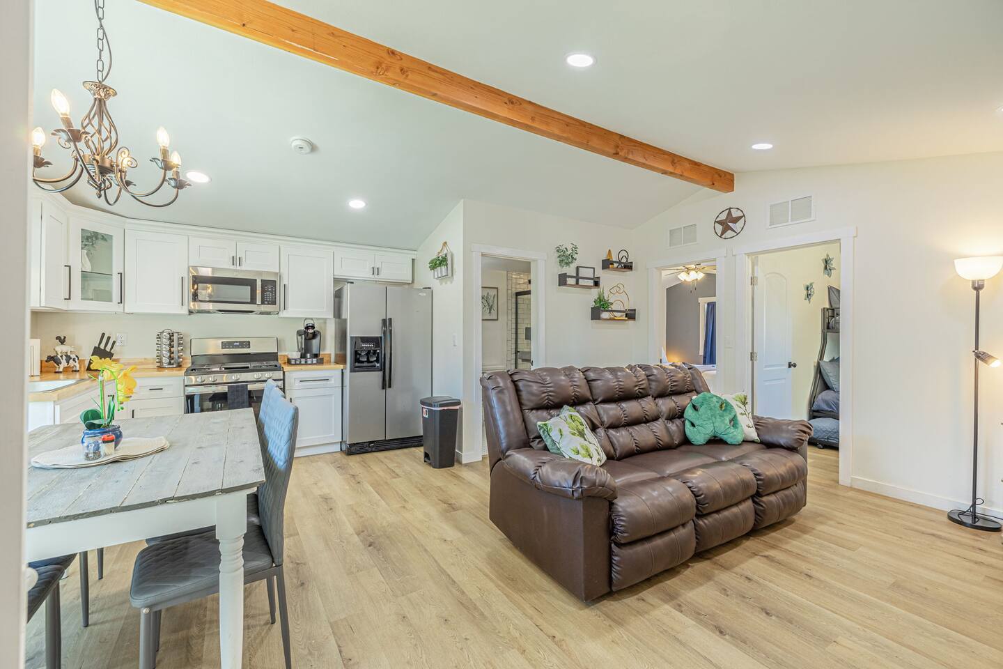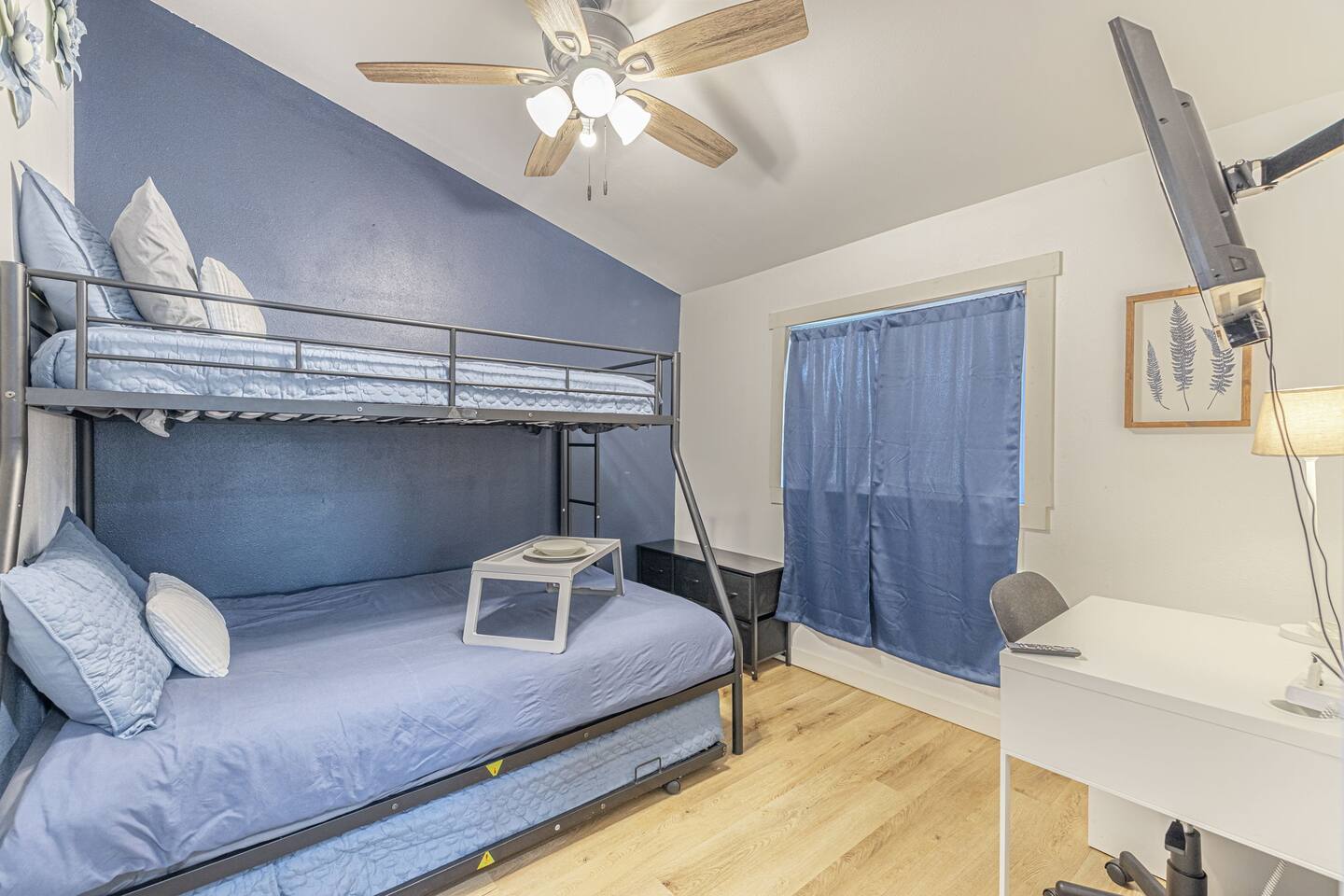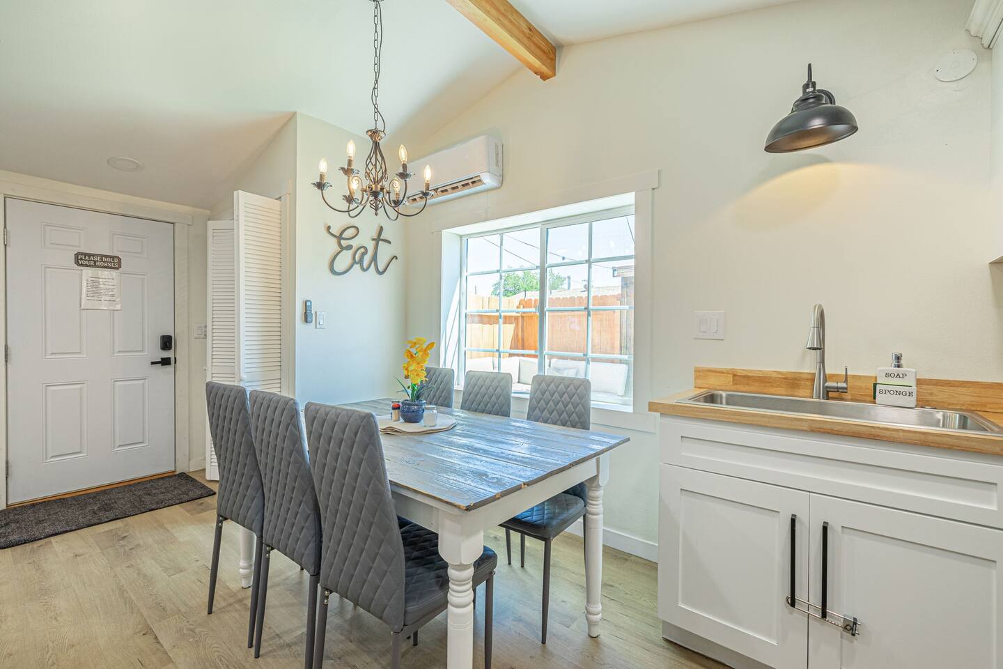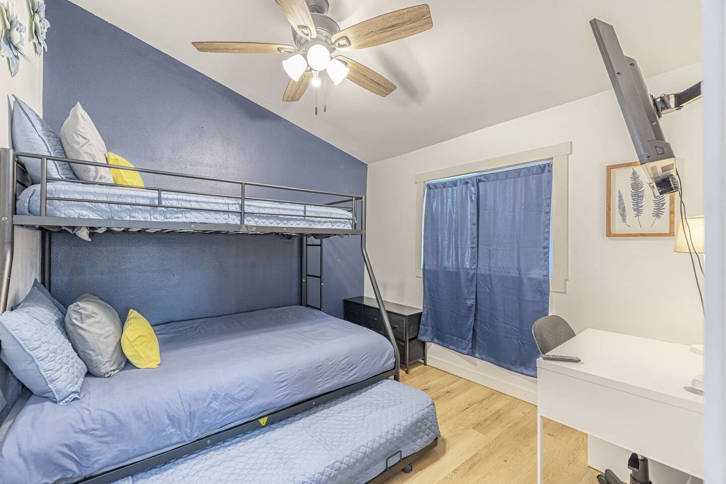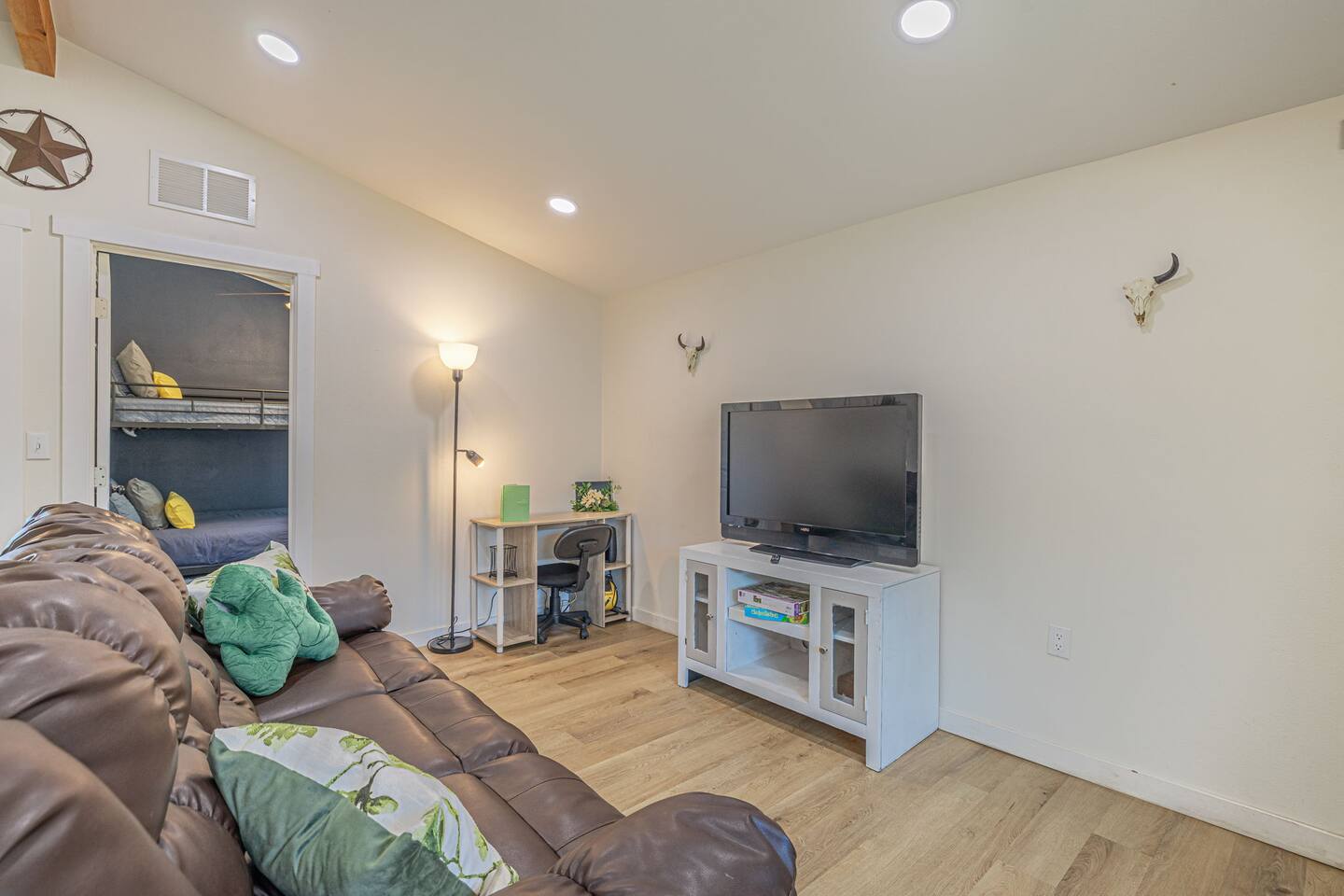 We take great pleasure in welcoming you to our Modern Ranch. This Farmhouse themed home offers everything you would ever need for a perfect care-free retreat in a spacious area, with a theme that compliments the natural light, western, and ranch delight decor. This home is a guest house. You have access to the entire home but to enter you will be passing through a driveway and a small dirt road. The Modern Ranch conveniently combines the living room, kitchen, and dining area with 2 bedrooms and smart tv's in each room to accommodate a joyful stay. Large windows allow for plenty of natural light to illuminate the space, and along with beautiful wooden floors, tasteful finishes, and leafy plants, to create a pleasantly warm ambiance. ★ BEDROOM 1 ★ ✔ Queen-Size Bed with Pillows, Linens, and Sheets ✔ 32in Smart TV ✔ Night Stand with Reading Lamp ★ BEDROOM 2 ★ ✔ Trundle Bunk Bed (2 Twin Size & 1 Full Size) with Pillows, Linens, and Sheets ✔ 32in Smart TV ✔ Stationary Desk for a dedicated workspace ✔ Dresser to place clothing ★ LIVING AREA ★ ✔ Smart TV ✔ Comfy Couch ✔ Stationary Desk for a dedicated workspace ✔ Side Coffee Table ✔ Lamp for added lightning ✔ Dimmable light switch for eye's convenience ✔ Board Games ★ KITCHEN ★ ✔ Microwave ✔ Toaster ✔ Blender ✔ Baking sheets ✔ Refrigerator/Freezer ✔ Keurig Coffee Maker (Complimentary Pods) ✔ Sink - Hot & Cold Water ✔ Trays ✔ Glasses ✔ Silverware ✔ Children's dinnerware ✔ Pots & Pans ✔ Hot Plate ✔ dining table set for 6 ★ BATHROOM ★ ✔ Rainfall Shower Head ✔ Bathtub ✔ Vanity ✔ Mirror ✔Hair dryer ✔ Toilet ✔ Towels ✔ Essential Toiletries ★ Laundry Closet ★ ✔ free washer and dryer included in stay ✔ clothing rack ✔ Ironing Board We look forward to hosting you. Let us know if you have any questions; we're locals; we have the answers. Happy Travels!